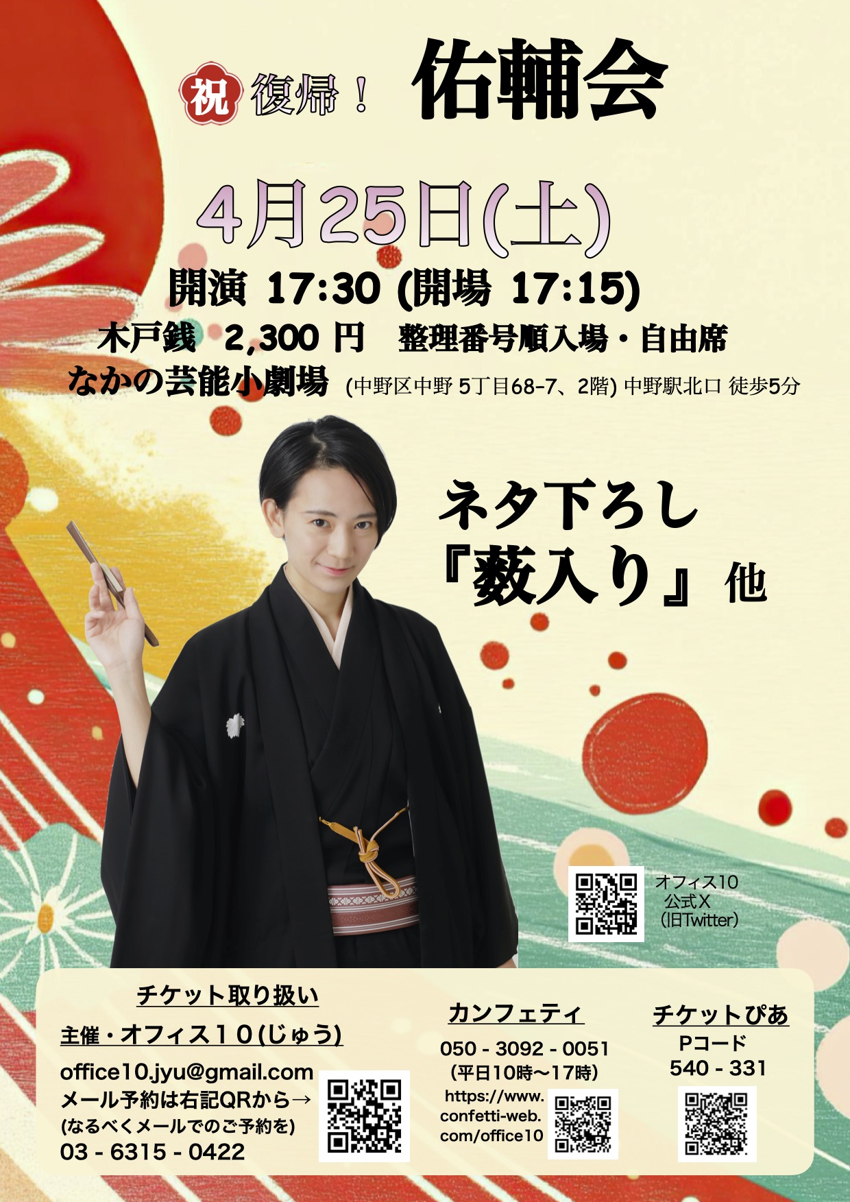4/25(土) 開場17:30開演18:00 会場 なかの芸能小劇場 住所 東京都中野区中野5-68-7 2階