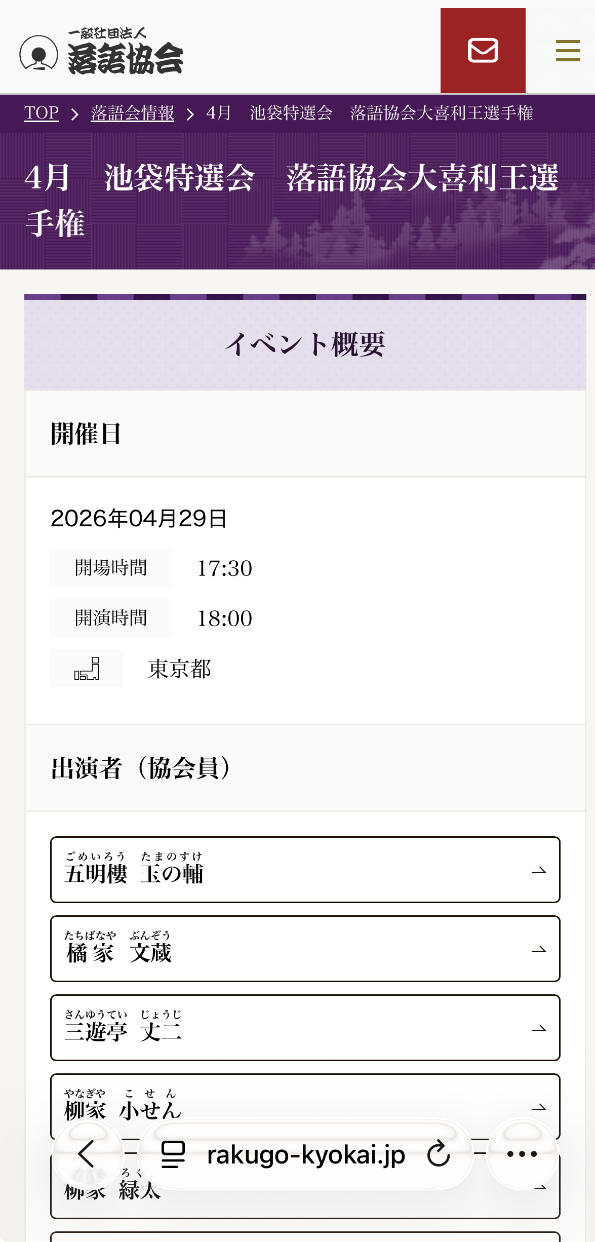 4/29(水) 開場17:30開演18:00 会場 池袋演芸場西池袋1-23-1 エルクルーセb2 住所 東京都豊島区
